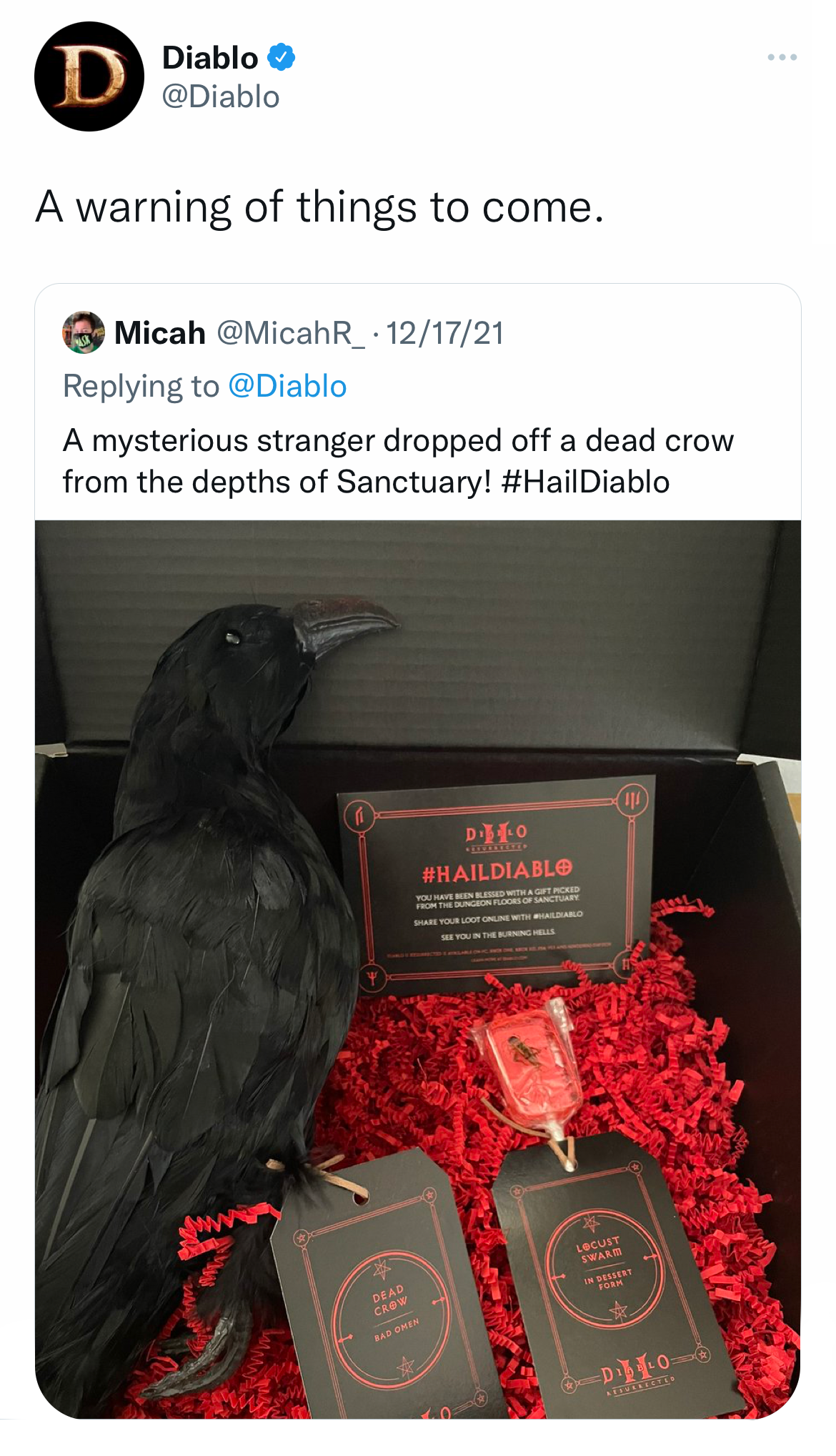 What We Did... To celebrate the holiday season, the video game franchise Diablo launched a Fooji campaign to honor His1 loyal followers. Gifts were sent to fans across the country from the dungeon floors of Hell when they used the hashtag #HailDiablo. Along with franchise merch, blessings from the Dark Lord2 included skulls, taxidermy rats, gems, and, yes, even real human teeth.3